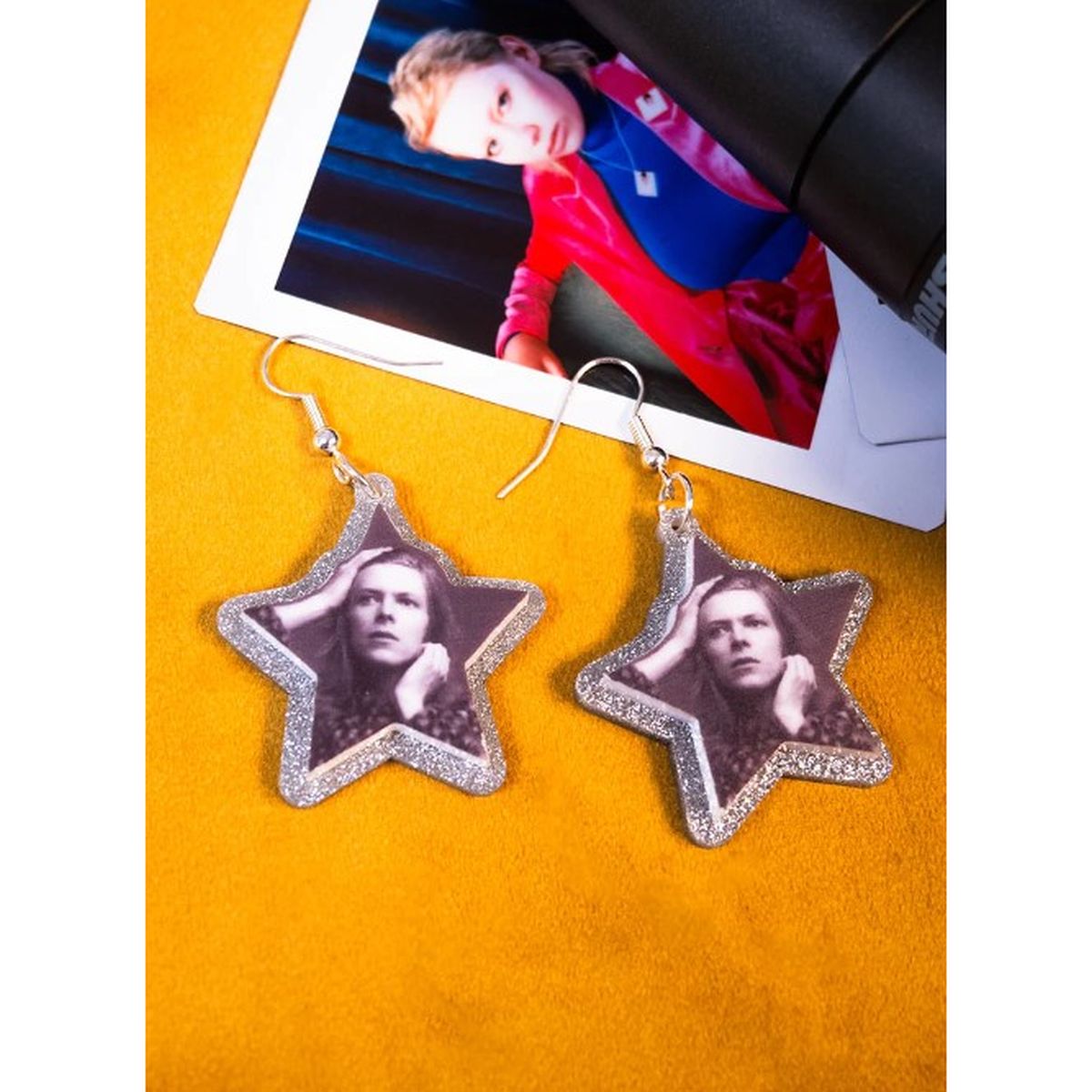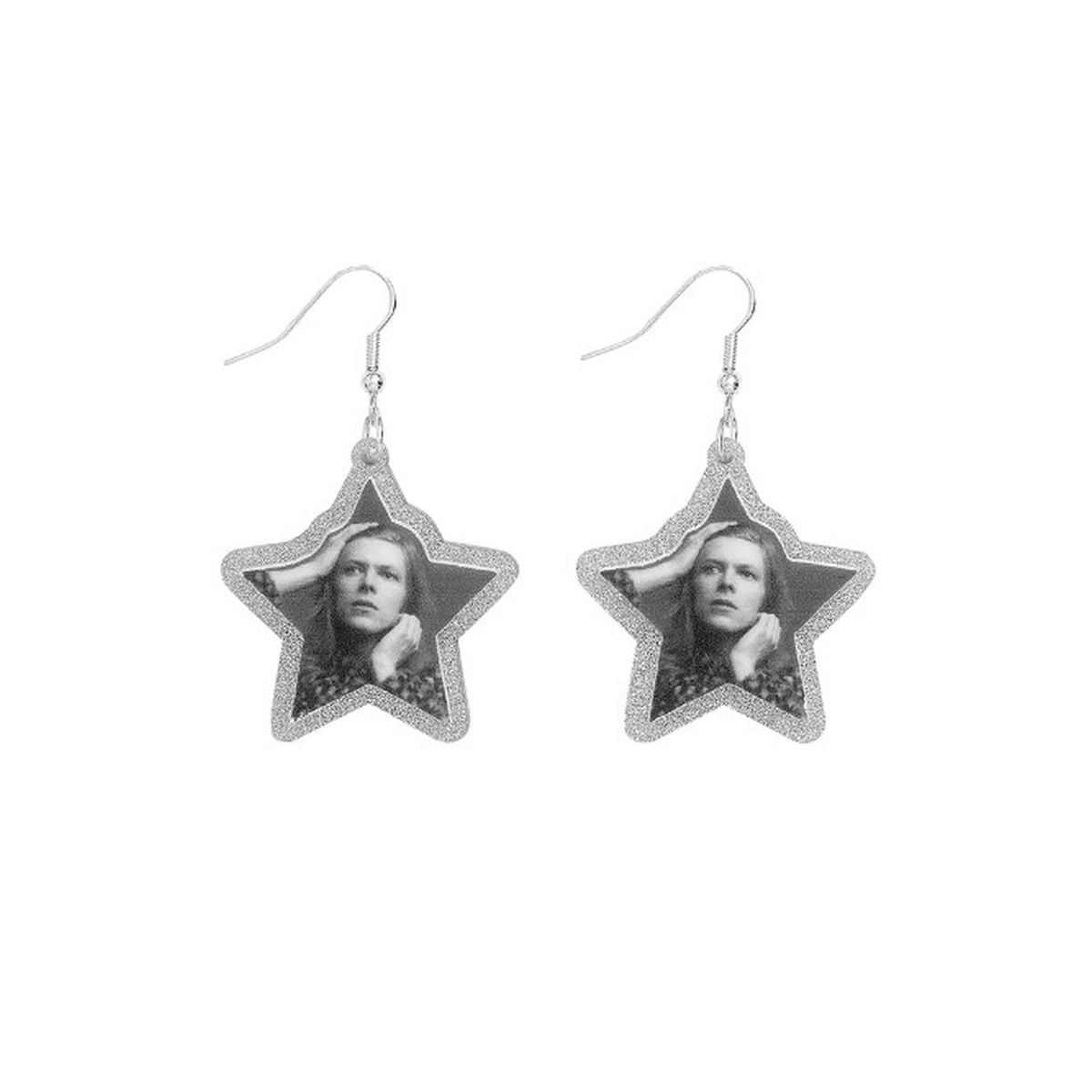 Take a journey with our Bowie Divine Symmetry Earrings. A homage to the alternative version of the iconic Hunky Dory album, weve digitally printed a pair of David Bowie portraits layered over sparkling silver glitter acrylic. Laser cut by our expert makers, these statement star earrings are suspended from hypoallergenic silver-plated hooks. Finished with an official Tatty Devine X BOWIE etch on the reverse, go all out and pair with the matching Bowie Divine Symmetry Pendant.