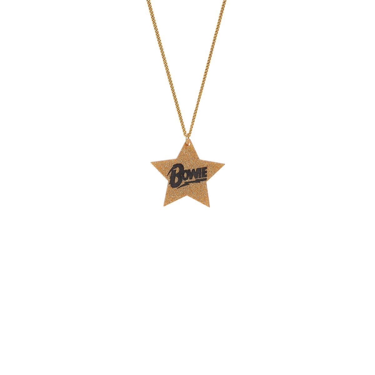 Pay homage to the brightest star in the sky with the Bowie Star Pendant. Never have to tell anyone your favourite musician again with David Bowies iconic Rebel Rebel inspired logo etched and hand inked onto a glittering gold dust star. Suspended from a gold-tone chain, complete with an official Tatty Devine X Bowie tag, let's sway under the moonlight.