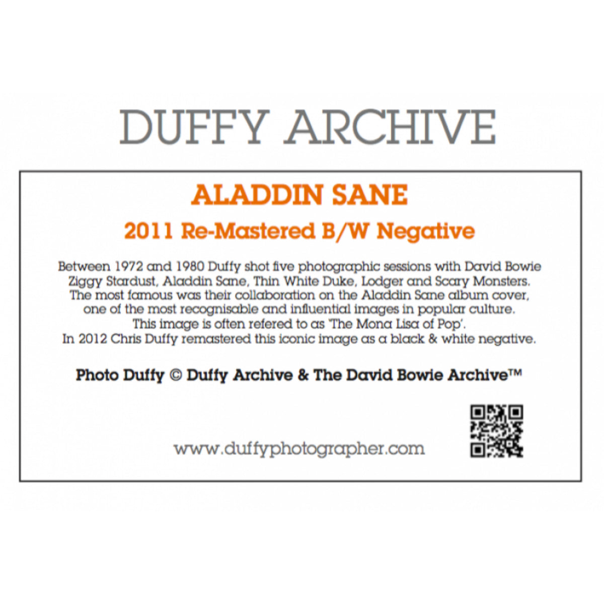 In 2011 the Aladdin Sane Black & White Negative remaster was created by Chris Duffy. This was to coincide with the opening of a Duffy: Bowie exhibition in Beverly Hills, California, at the Stephen Webster Gallery. The image was in such high demand that it was made accessible in an open edition. The image is printed on matte paper, further enhancing the depth of the blacks and the effect of the image, making it a perfect contrast or companion to the other iconic Aladdin Sane images.Unsigned Mounted Open Edition Prints