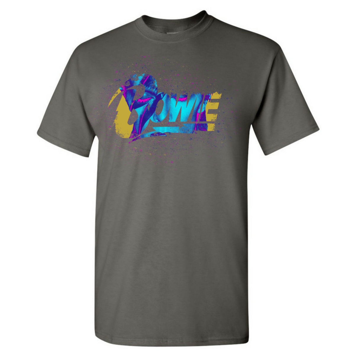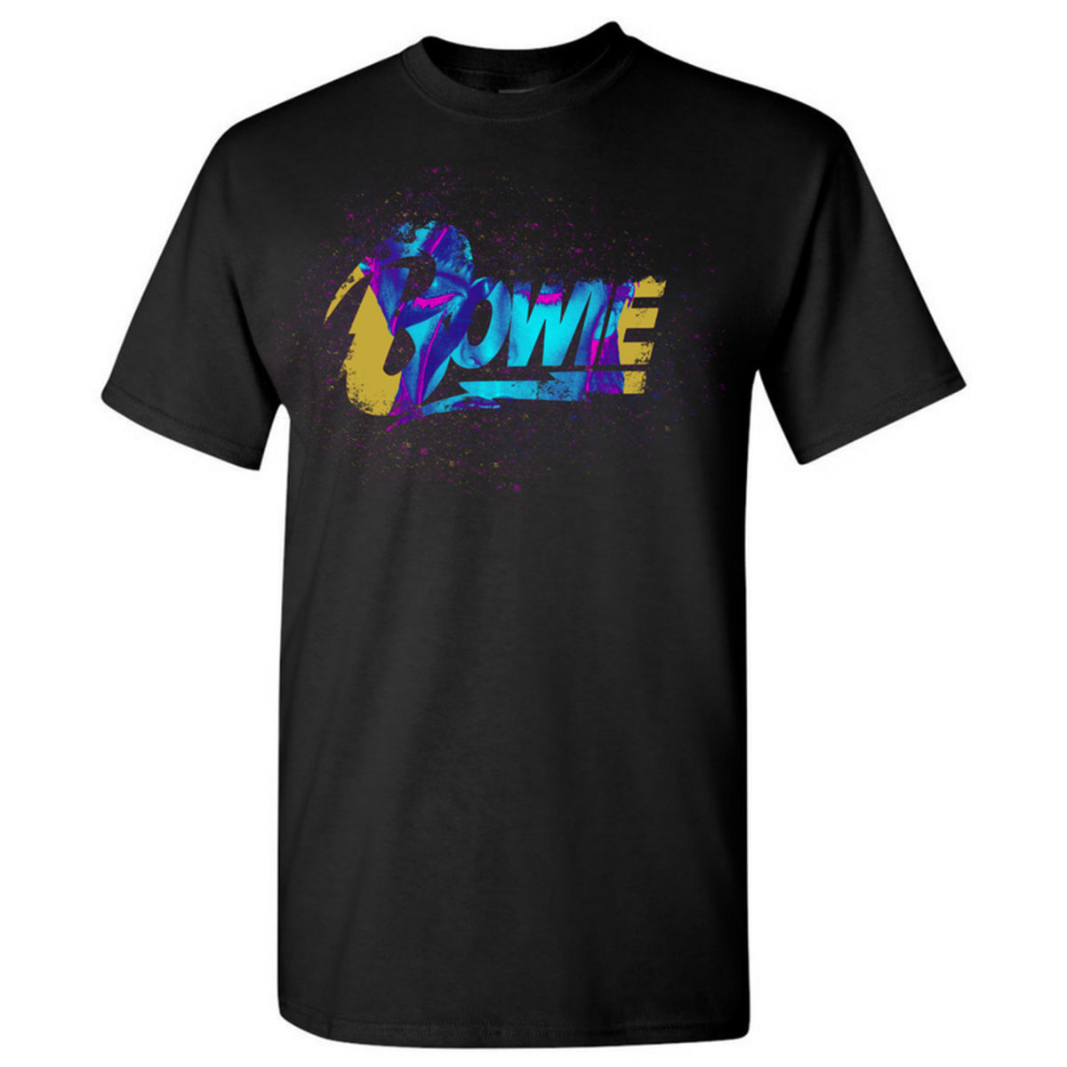 It's Bowie meets Pollock on this shirt where the clean lines of the Bowie logo clash with neon and splashes of color. This is a print-on-demand item. Please allow two additional days for order processing. POD item are non-returnable and exchanges will not be accepted except in the case of defective merchandise.