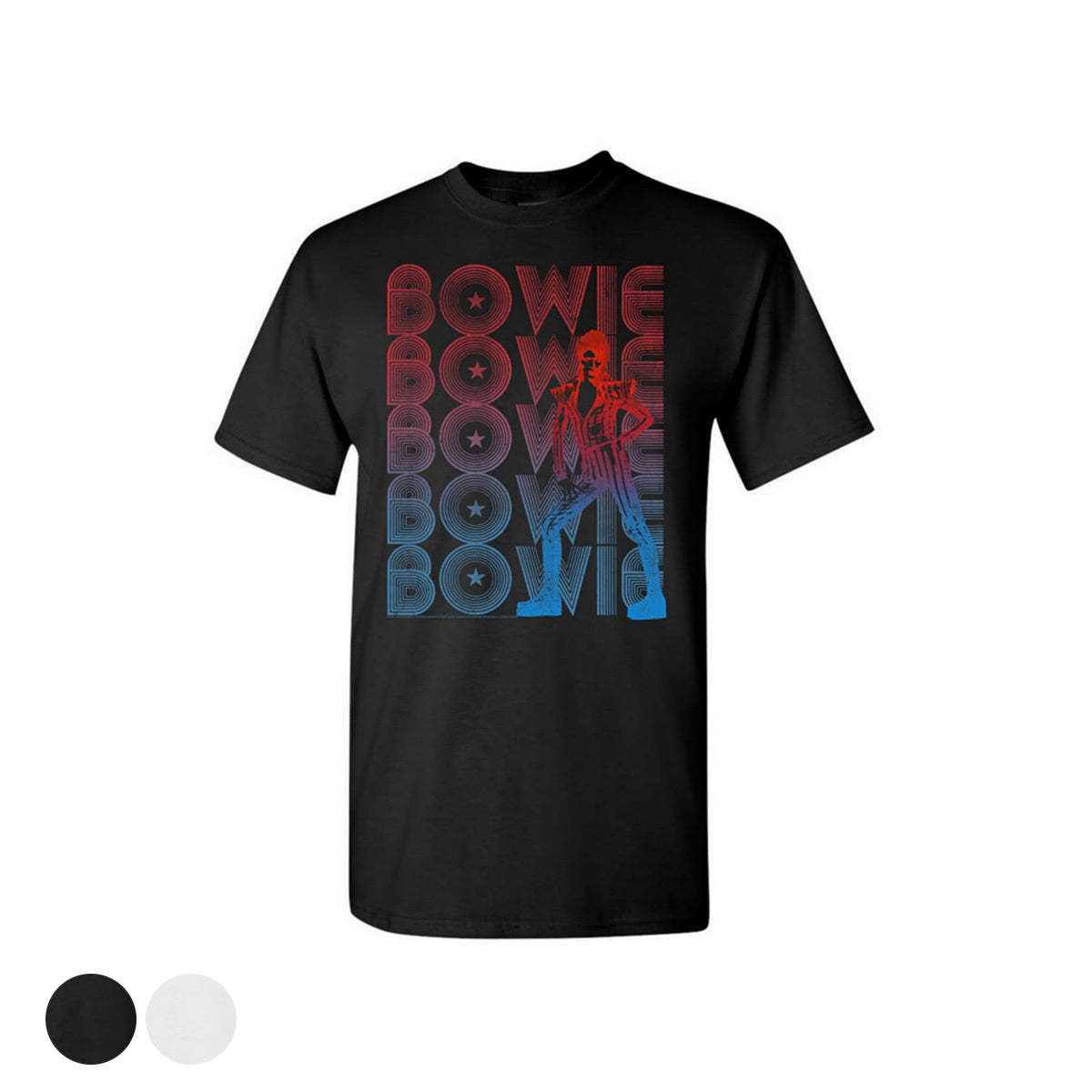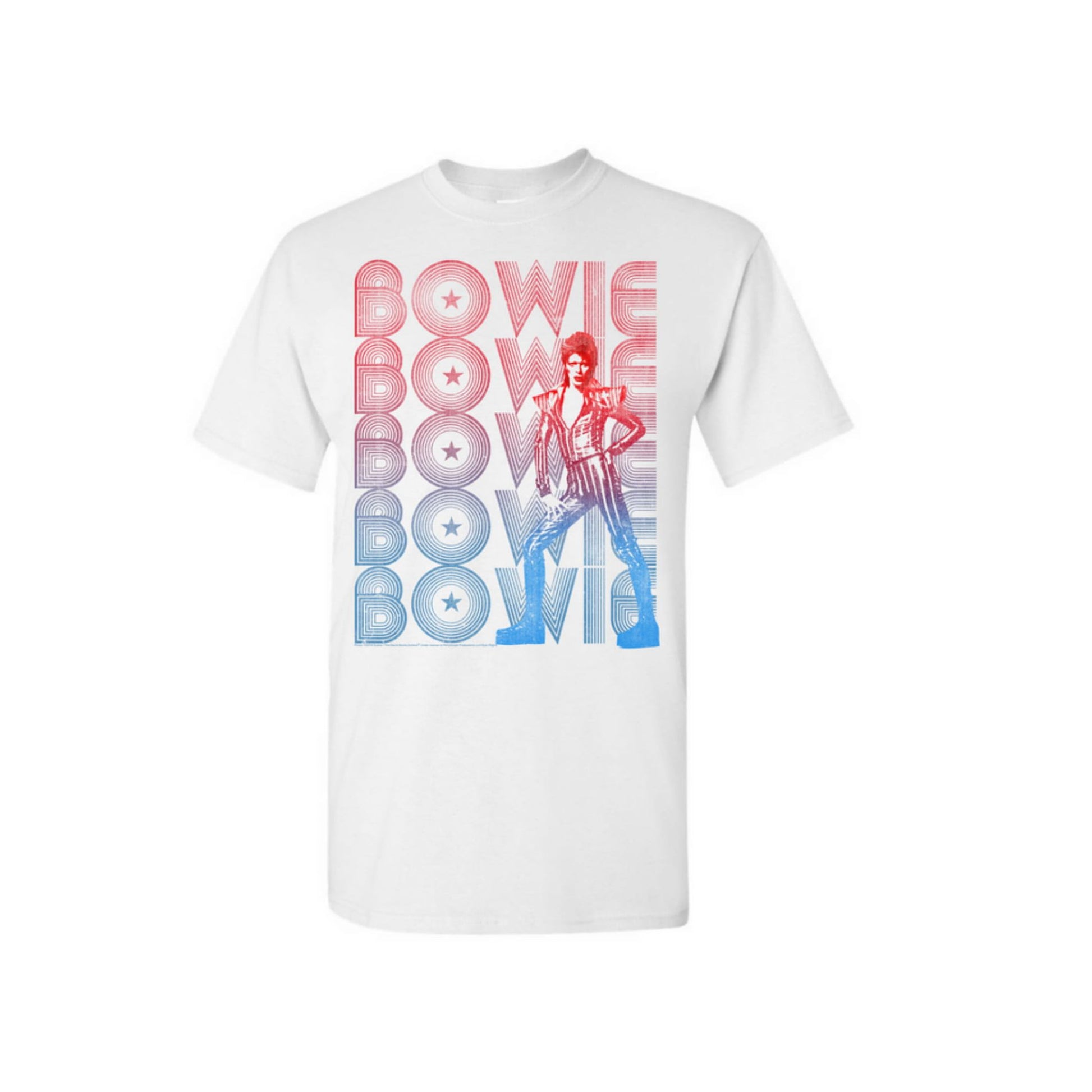 A repeat Bowie in a faded red to blue graphic, with the iconic David Bowie posed on the front. This tee is printed on a 100% ring-spun cotton. This is a print-on-demand item. Please allow two additional days for order processing. POD item are non-returnable and exchanges will not be accepted except in the case of defective merchandise.